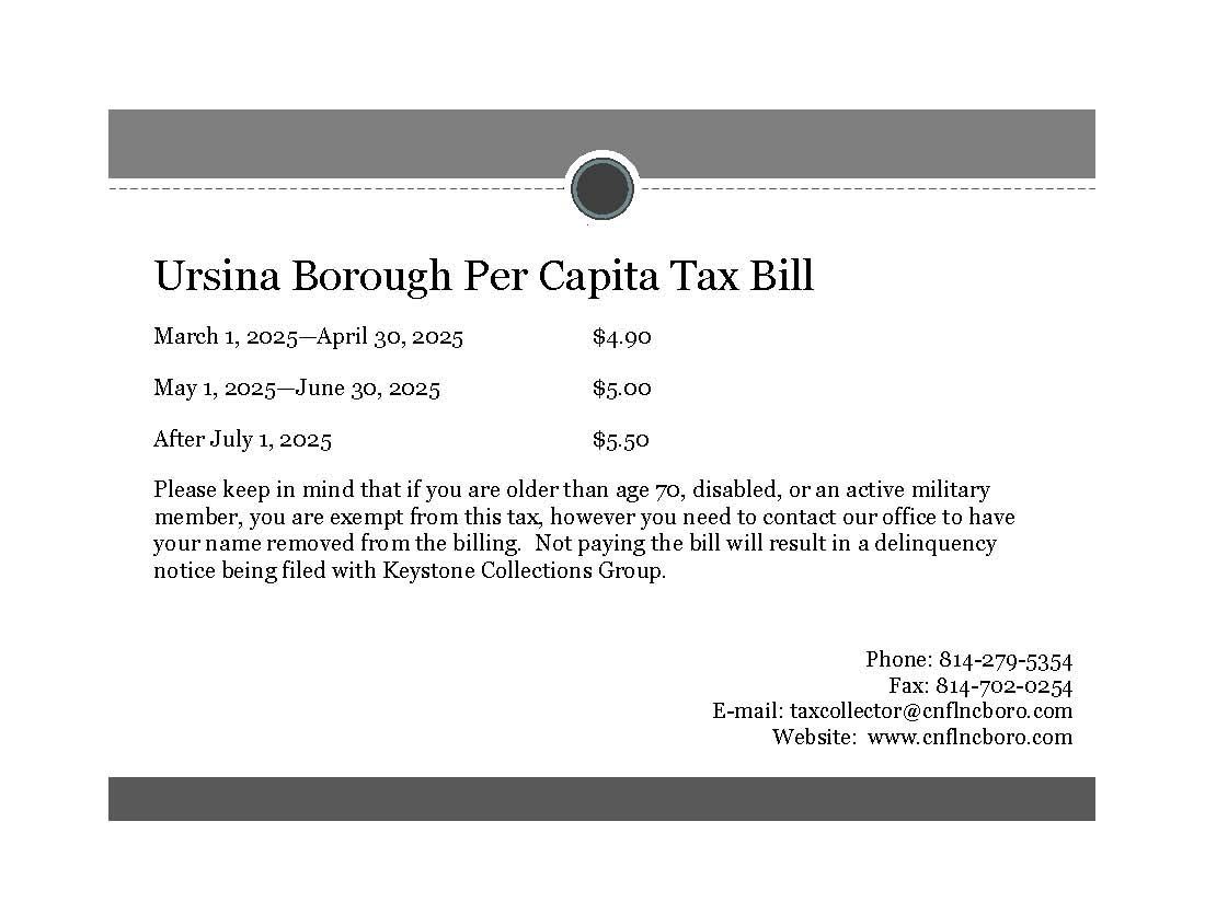 The County is implementing new technology systems. Online payments will soon be available to all tax collectors. Confluence and Ursina boroughs already have the ability to pay online. We will let you know if/when we will have the ability to post your tax bills online. Stay tuned...